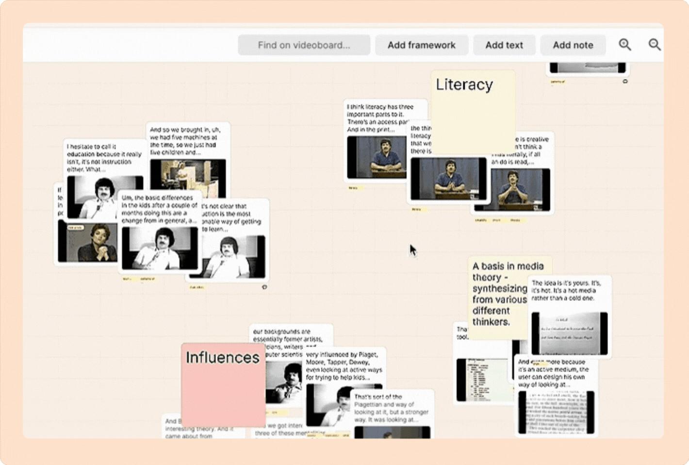 The videoboard is a 2D canvas where you can arrange highlights, recordings, and labels to help make sense of your material, and shape your story.