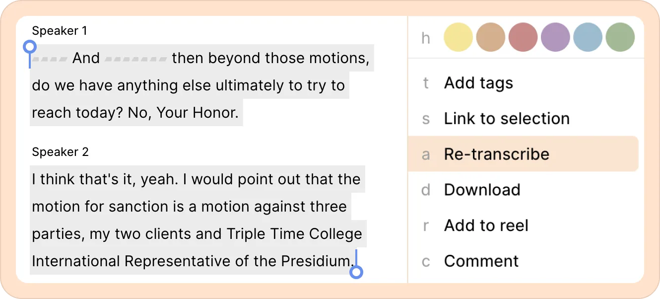 - Now click on the Re-transcribe button. Reduct will reprocess that section of audio and automatically update the transcript.