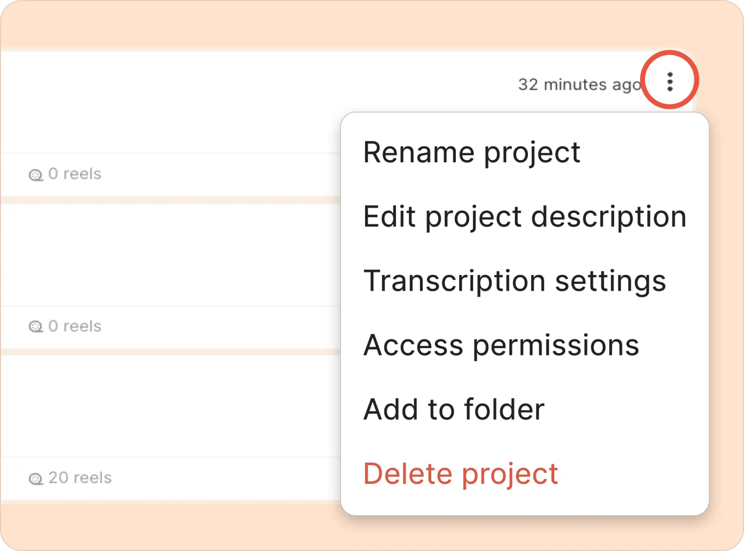 Most actions start from the three-dot kebab (︙) menu next to each project.