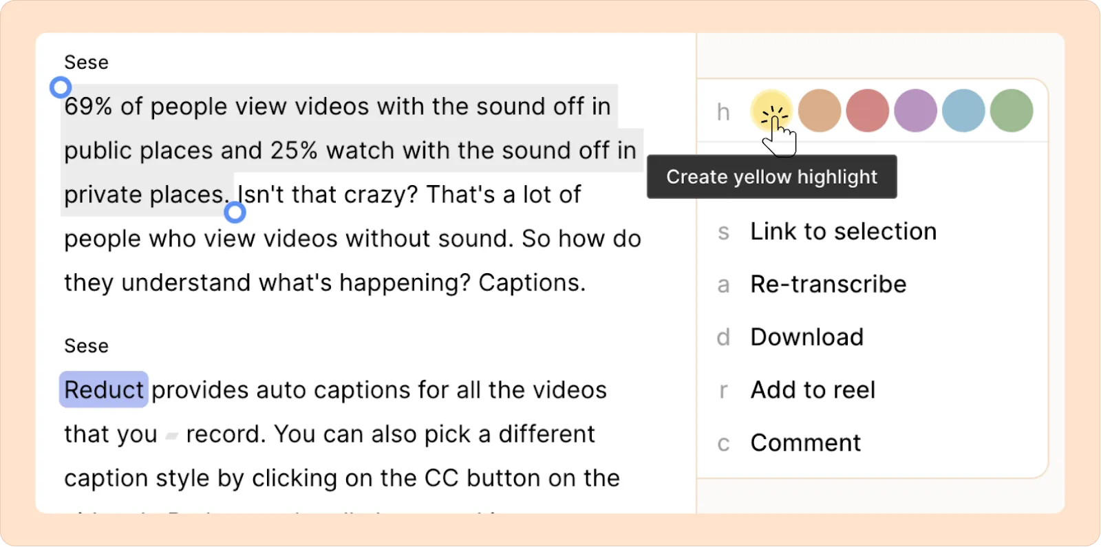 - Using the menu that appears next to your transcript, either click Highlight or hit the h key on your keyboard.