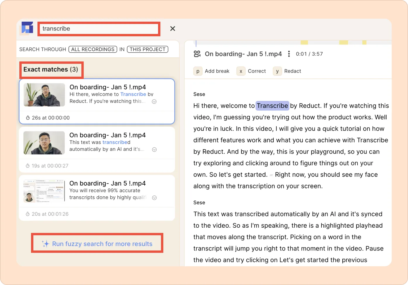 Our search will show the exact matches for the term you put in, followed by fuzzy matches. Reduct's NLP-based AI will find all relevant and related terms in each recording within this project.