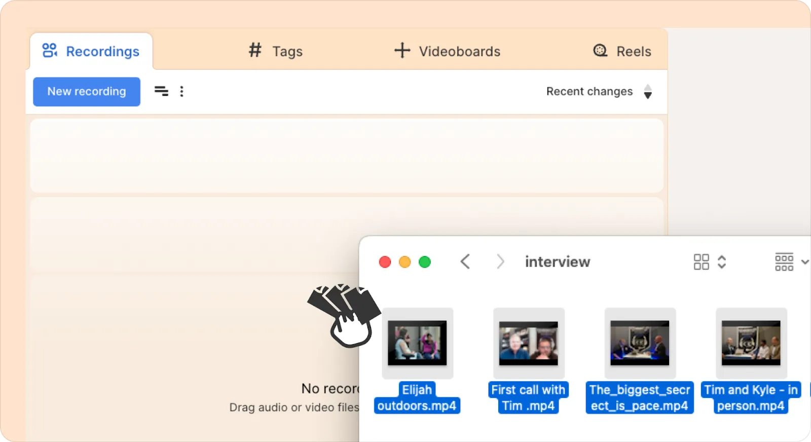 You can upload your recordings in bulk with a simple drag and drop. Just open your folder, select the files that you want to upload and drag and drop them onto the left-hand side panel (sidebar) in Reduct.
