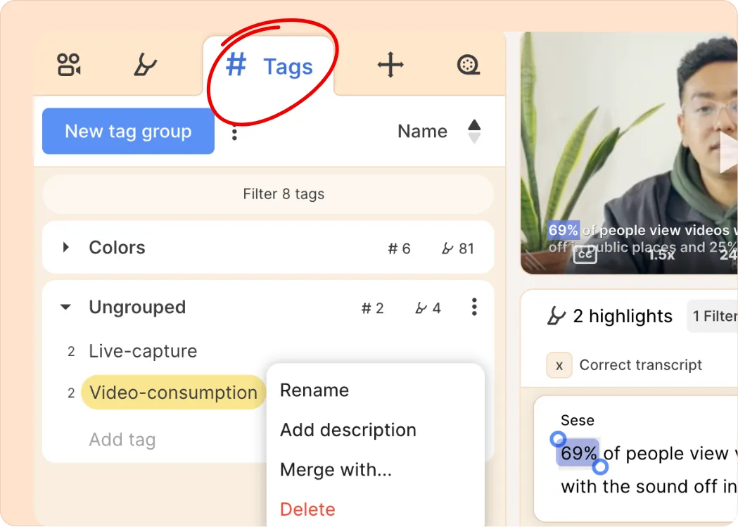 If you switch the left sidebar to Tags, you’ll see all the tags currently in your project. From there, you can manage them: rename, group, merge, and more.