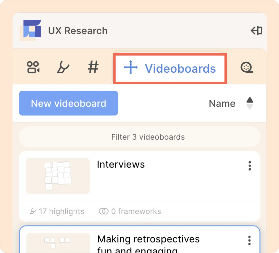 If your project demands more nuanced analysis, synthesis, or narrative flow than you can keep track of mentally, you can bring your highlights into a videoboard, where you can think and collaborate spatially.