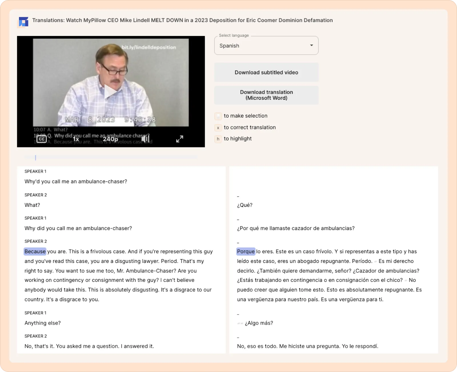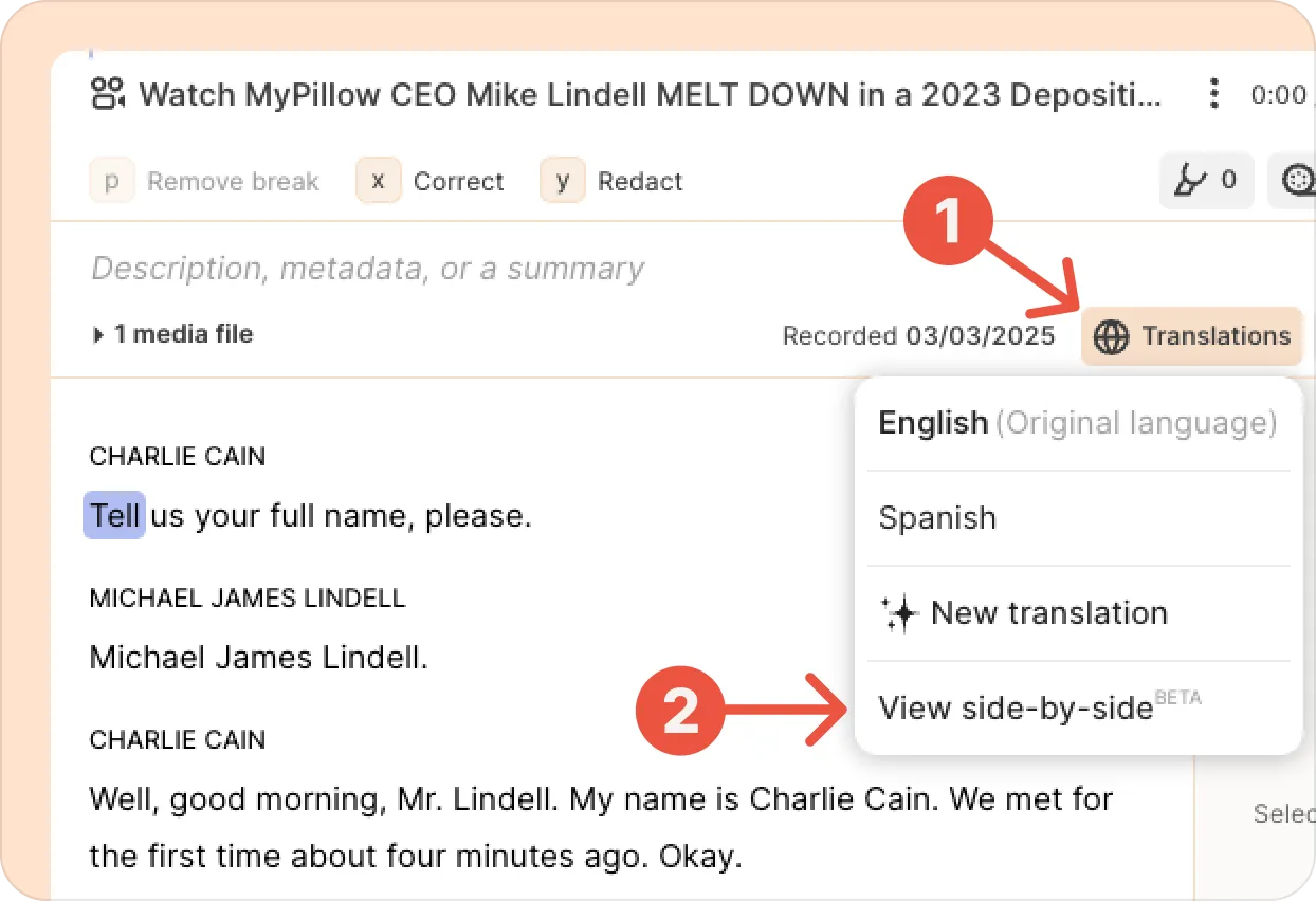 - A new window opens up with the original transcript on the left and the translations on the right. Translations are auto-synced, so you can click any word in the translation and Reduct will take you to that exact moment in the recording.